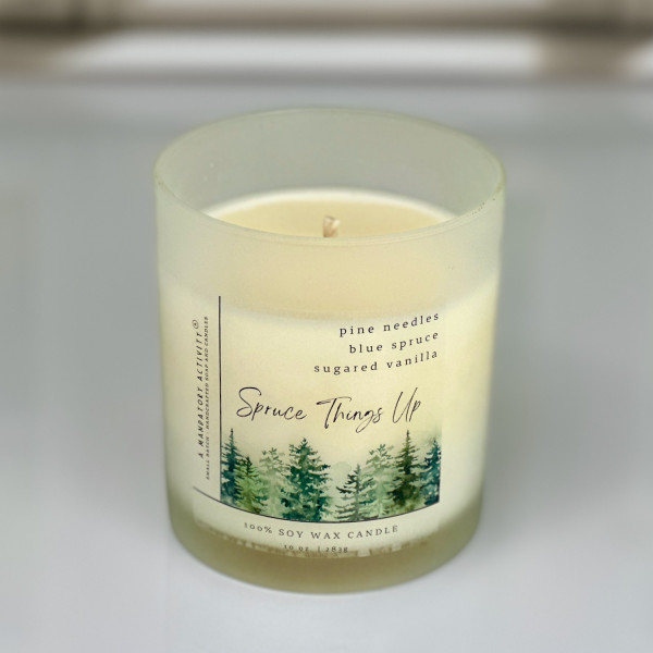 Spruce Things Up is available in a 10 oz frosted glass jar with an approximate burn time of 50-70 hours, a 3.5 oz wickless candle, and a 2.75 oz wax melt.